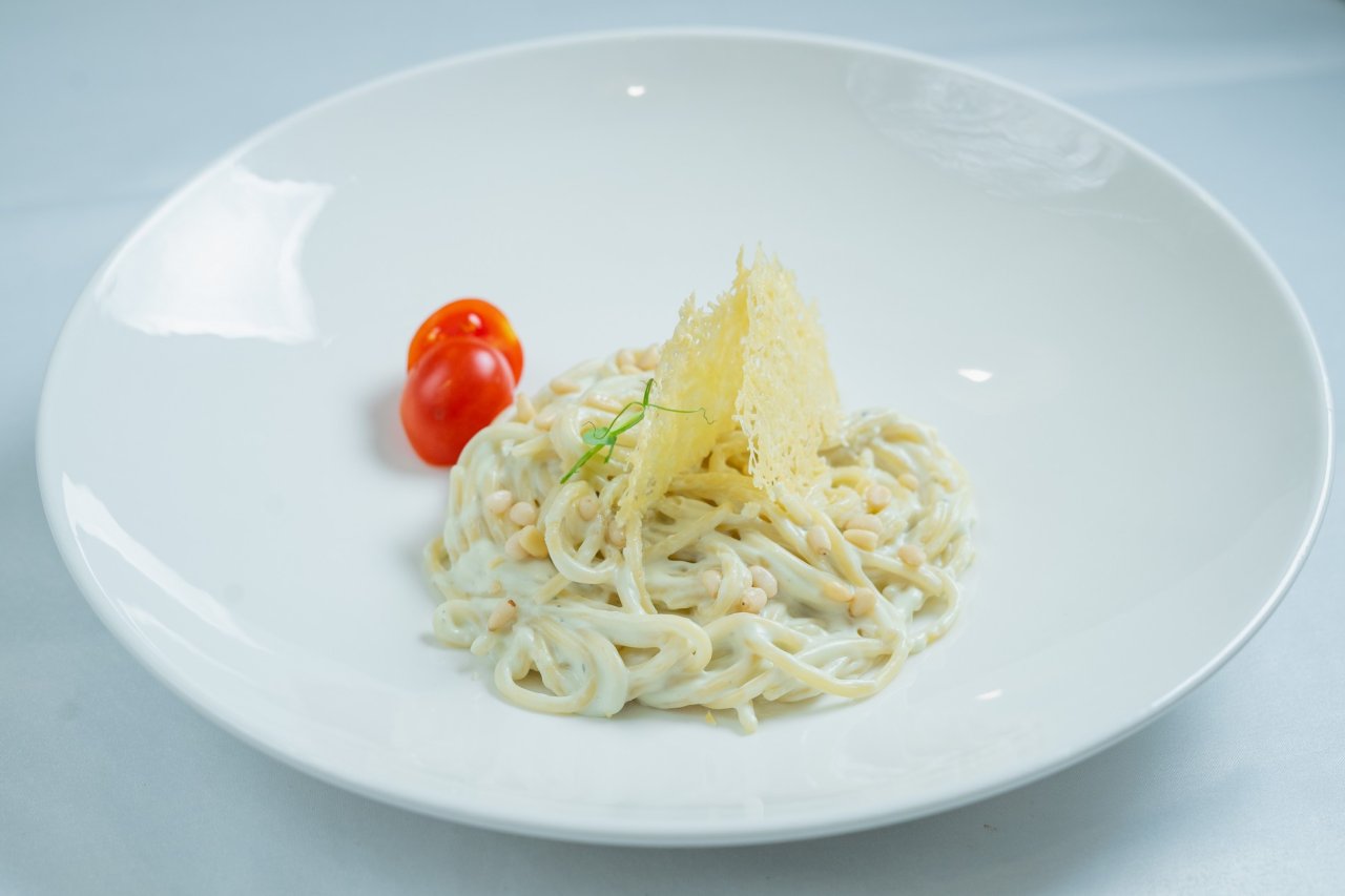 Состав: нежная паста с сырами моцарелла, пармезан, дор блю и творожный сыр затянутая сливками, украшение чипсами из пармезана.