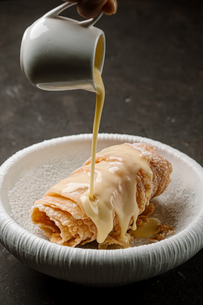 Хрустящее тесто для хвороста из муки и яиц, а так же уксуса который придает десерту особый хруст. Посыпается сахарной пудрой. При подаче перед гостем поливаем кремом англез (заварной крем на основе молока и сливок).