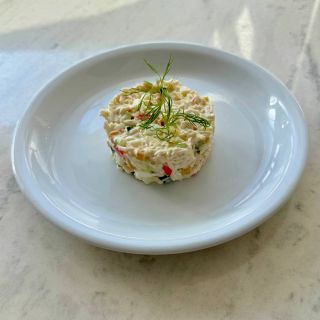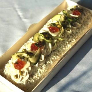 Ветчина, картофель, морковь, огурцы свежие и соленые, горошек, яйцо, майонез, икра красная. Данное блюдо доступно по предзаказу за 2 дня