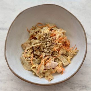 Состав : говяжья вырезка, , соус на основе кимчи и кунжутного масла с добавлением соевого соуса, красный лук и микрозелень .
